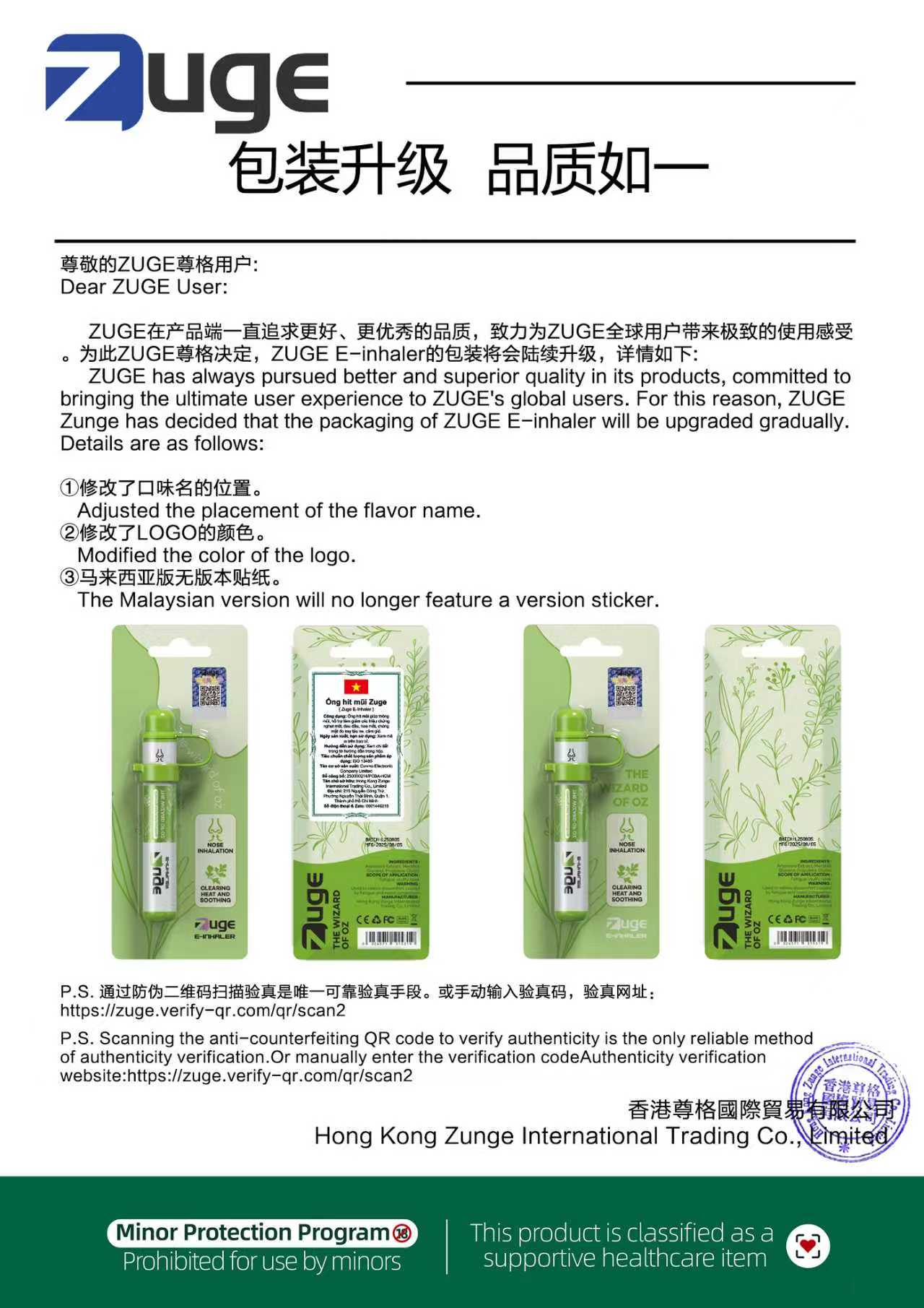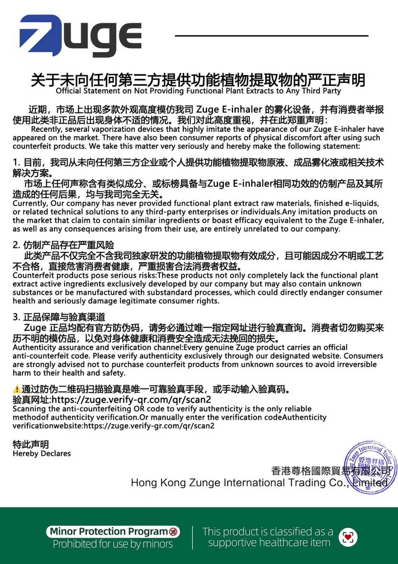 Recently, atomizer devices that closely resemble the Zuge E-inhaler have appeared on the market, and some consumers have experienced discomfort after using them. Zuge does not currently provide functional plant extract concentrates, finished products, or technology to any third party. Zuge is not responsible for any consequences caused by counterfeit products. Consumers are advised to carefully identify these devices to avoid being deceived or taking health risks.